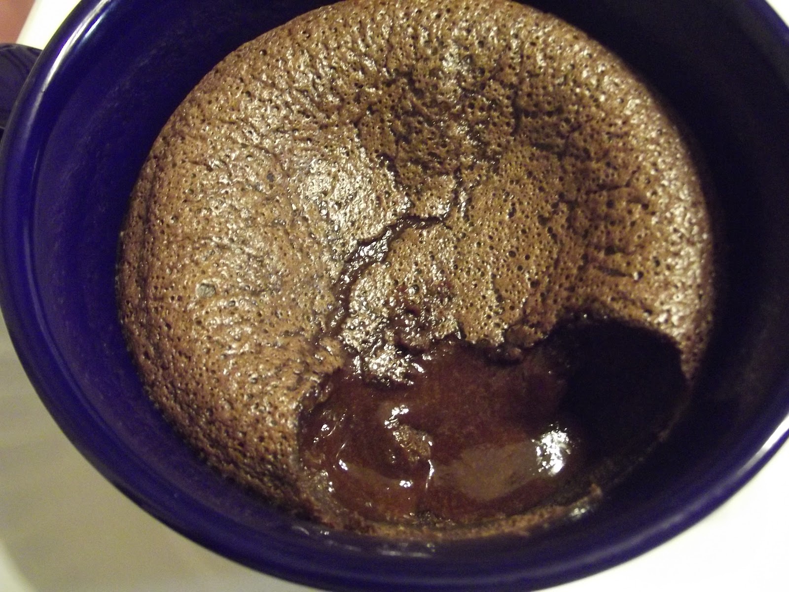 Coat ramekins or individual baking dishes with a very light coat of oil. (I used olive oil.) Divide mixture between baking dishes. Bake for 15 - 20 minutes until it looks done. Baking time will depend upon the size of your baking dishes. Ours are large, so it actually took 22 minutes. Remove from oven. The chocolate inside will be melted. Serve warm and enjoy.